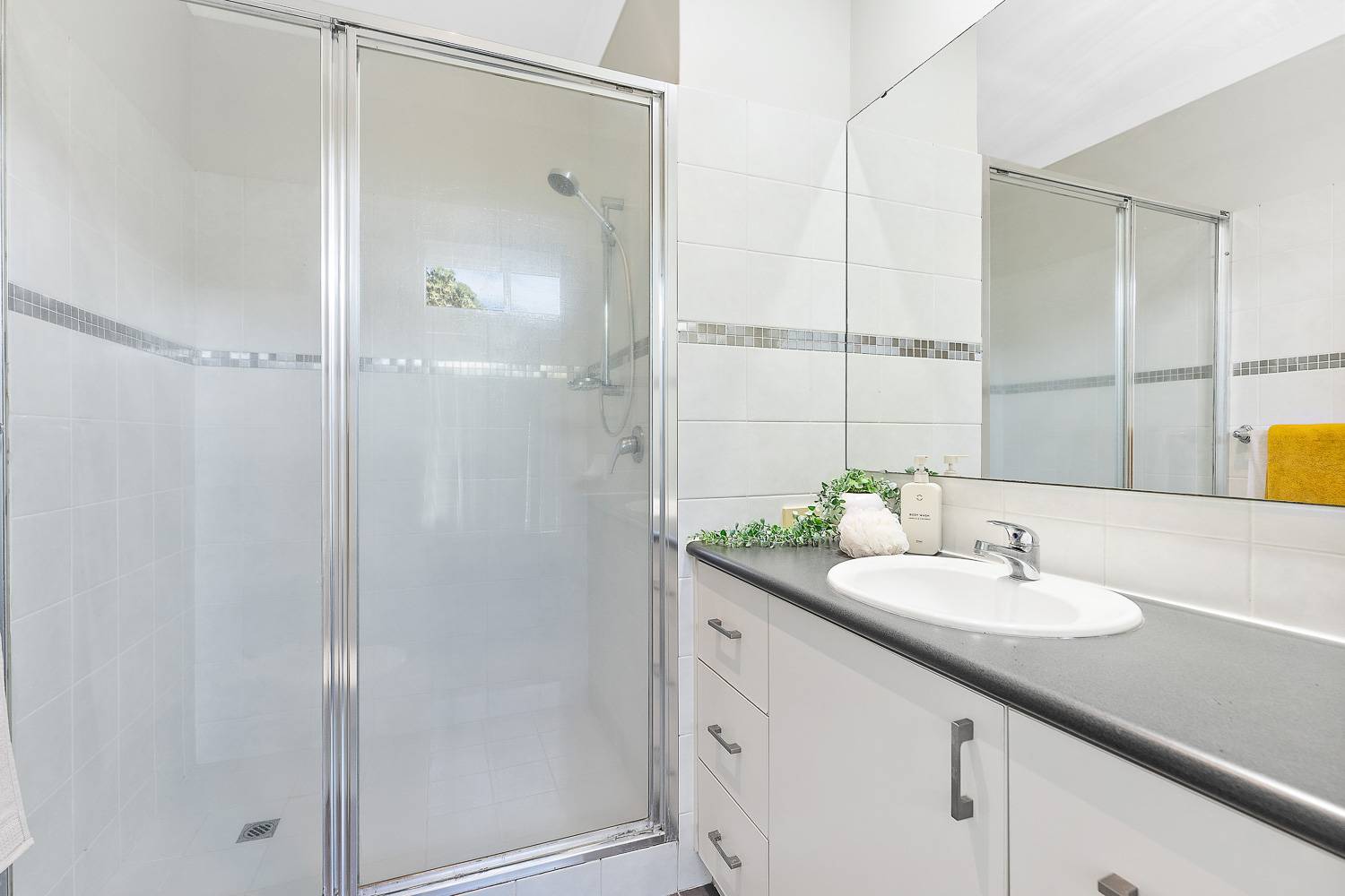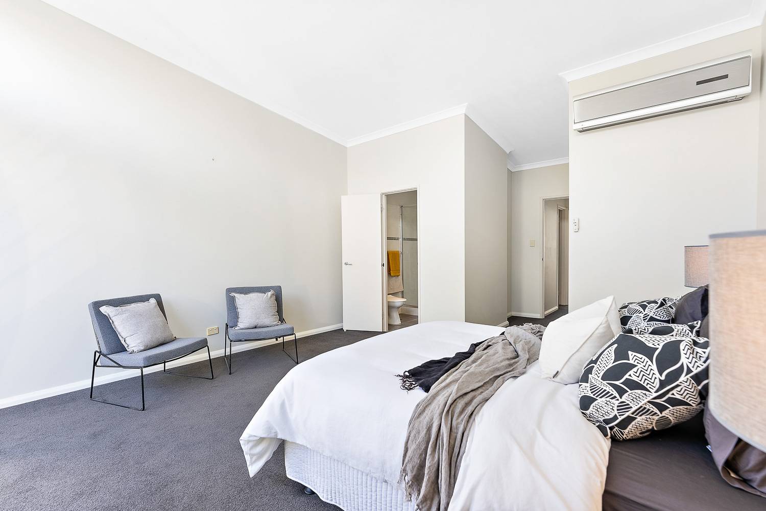 Upstairs are two big bedrooms, both with robes and two bathrooms. The master has vaulted ceilings, another aircon and a juliet balcony.